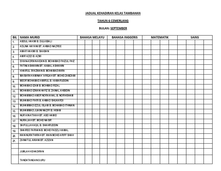 Jadual Kehadiran Guru N Murid Docx Document