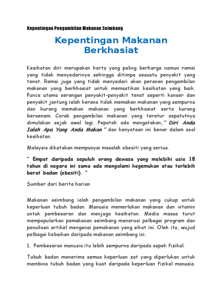Diperlukan oleh tisu dan sel badan untuk proses tumbesaran 3. Makanan yang seimbang adalah mustahak kerana ia membekalkan zat dan nutrien yang berkhasiat untuk tumbesaran tubuh badan manusia. Sebagaimana yang kita ketahui makanan seimbang ialah pengambilan makanan yang cukup untuk keperluan tubuh badan manusia yang amat memerlukan makanan dan vitamin untuk pembesaran dan penjagaan kesihatan. Persoalannya apakah kepentingan makanan seimbang kepada tubuh badan kita.