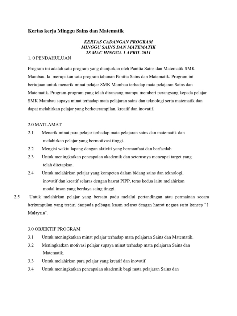 Program ini diadakan dengan matlamat untuk mengcungkil bakat dan minat pelajar terhadap mata pelajaran sains dan matematik yang dianggap sebagai mata pelajaran yang sukar dan membosankan. Kertas kerja lengkap dengan contoh aktiviti perbelanjaan dan ajk. Kertas kerja program bulan sains dan matematik slideshare 28 apr 2013 kertas kerja program bulan sains dan matematik 2013. Kertas cadangan program minggu sains dan matematik 28 mac hingga 1 april 2011 1.