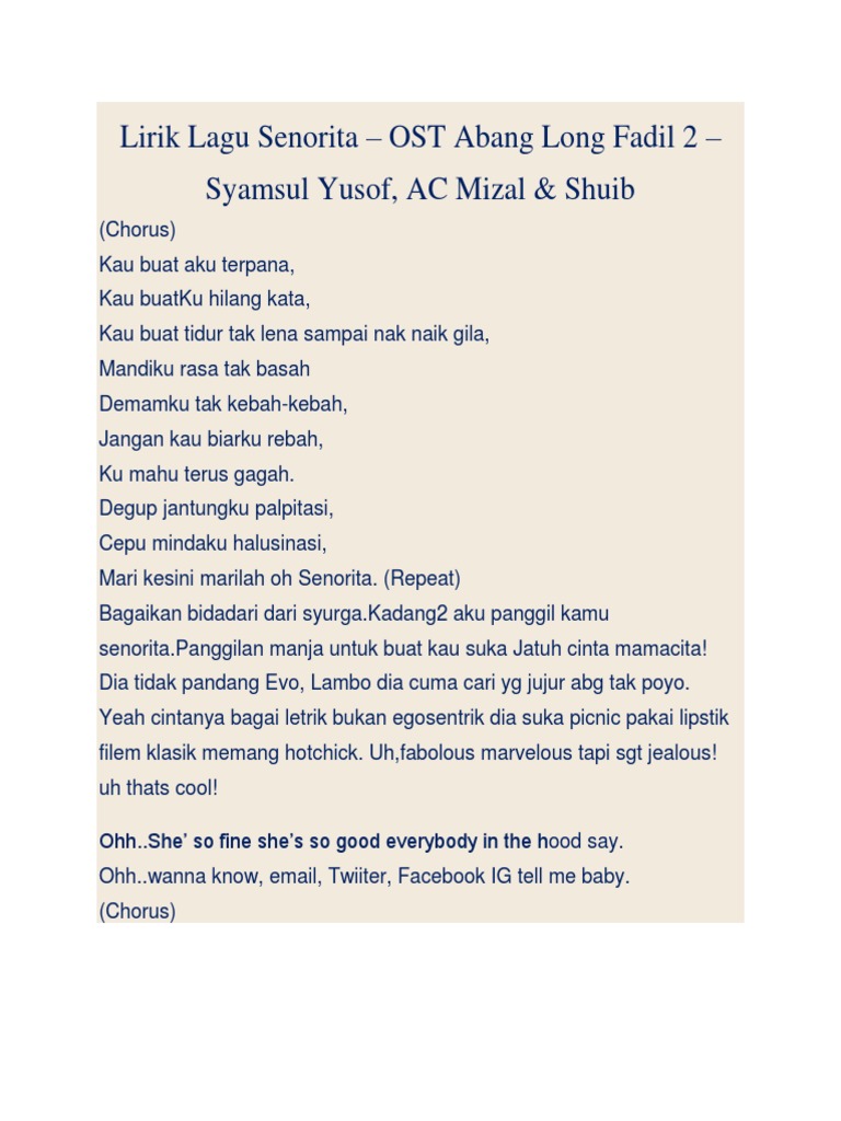 Lirik Lagu Ost Abang Long Fadil 2 Senorita Syamsul Yusof Dato Ac Mizal Feat Shuib Sayidahnapisahdotcom